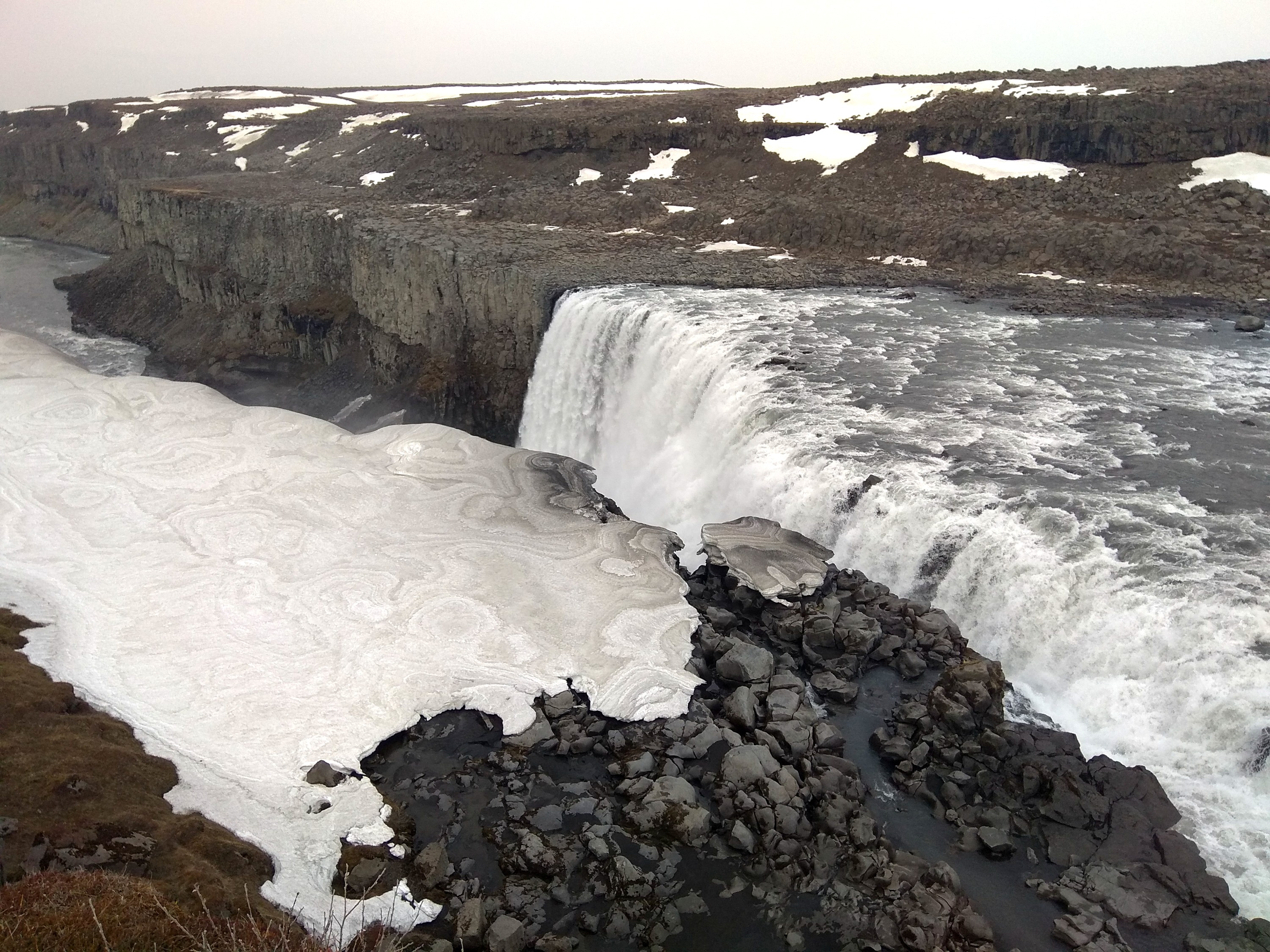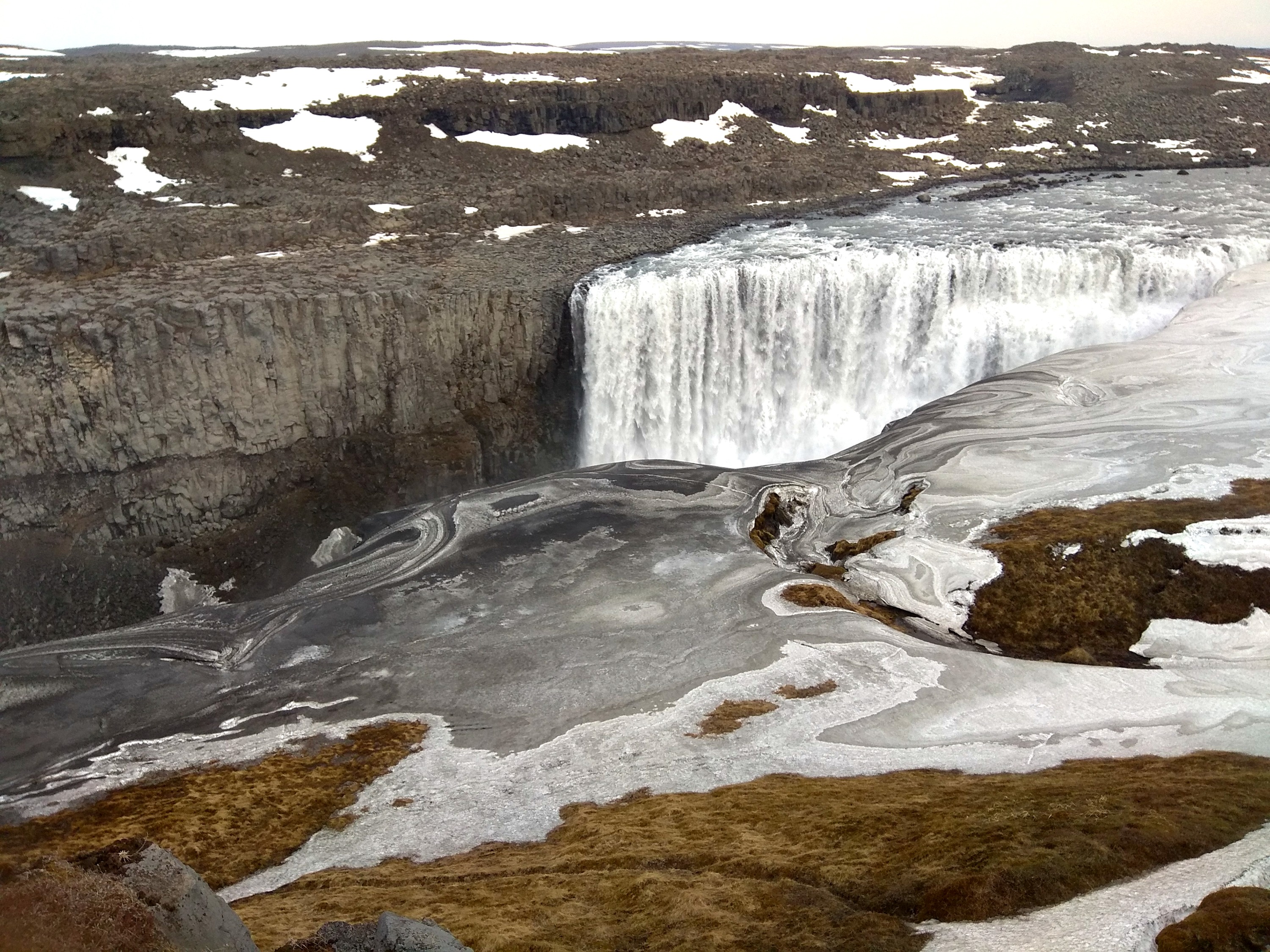 Κλείνοντας το κυνήγι των καταρρακτών, και εξαιρώντας κάποιους που είδαμε από μακριά ή ακούσαμε, φτάνουμε στον Detifoss. Βρίσκεται στο εθνικό πάρκο Vatnajökull και αποτελεί τον μεγαλύτερο και ισχυρότερο καταρράκτη της Ευρώπης. Ο υπερθετικός των επιθέτων σίγουρα προσθέτει στο δέος που διακατέχει τον θεατή που τον θαυμάζει. Εμένα με συντάραξε όλο το πλαίσιο της ύπαρξης του. Για να τον φτάσουμε περπατήσαμε περί των 45 λεπτών. Ο δρόμος ήταν γεμάτος λιωμένους πάγους και λασπώδες έδαφος, στο οποίο είχαν προστεθεί διάφορα ξύλα για να σωθούν τα υποδήματα των ταξιδιωτών. Φτάνοντας εκεί σε εξιτάρει το ηφαιστιογενές τοπίο. Φυσικές εξάγωνες κολώνες (σχηματισμένες από λάβα) έδιναν ροή στην απότομη κίνηση των δυναμικών και γκριζωπών, λόγω των ηφαιστειακών ιζημάτων, νερών του. Μέσα από τη δυναμική, τραχιά, σταθερή και επιβλητική τους θέση ενώνονται με την αέναη κίνηση των ορμητικών νερών. Το γιν και το γιαν δίνουν τα ρέστα τους με άλλα λόγια! Μένοντας για αρκετή ώρα αποσβολωμένοι, θαυμάζαμε παράλληλα τα χιόνια να λιώνουν σε υπέροχα ασπρόμαυρα μοτίβα (άσπρο του χιονιού, μαύρο της λάβας). Φεύγοντας πλημμυρισμένοι με νέες εικόνες αμβλύναμε το αρχικό δίλημμα, αν θα πάμε στο Selfoss ή στον Detifoss, προχωρώντας κάποια έξτρα μέτρα για να δούμε από μακριά τον Selfoss, και ακόμα κι έτσι, μία αποχαύνωση αντικρίζοντάς τον, τη νοιώσαμε!