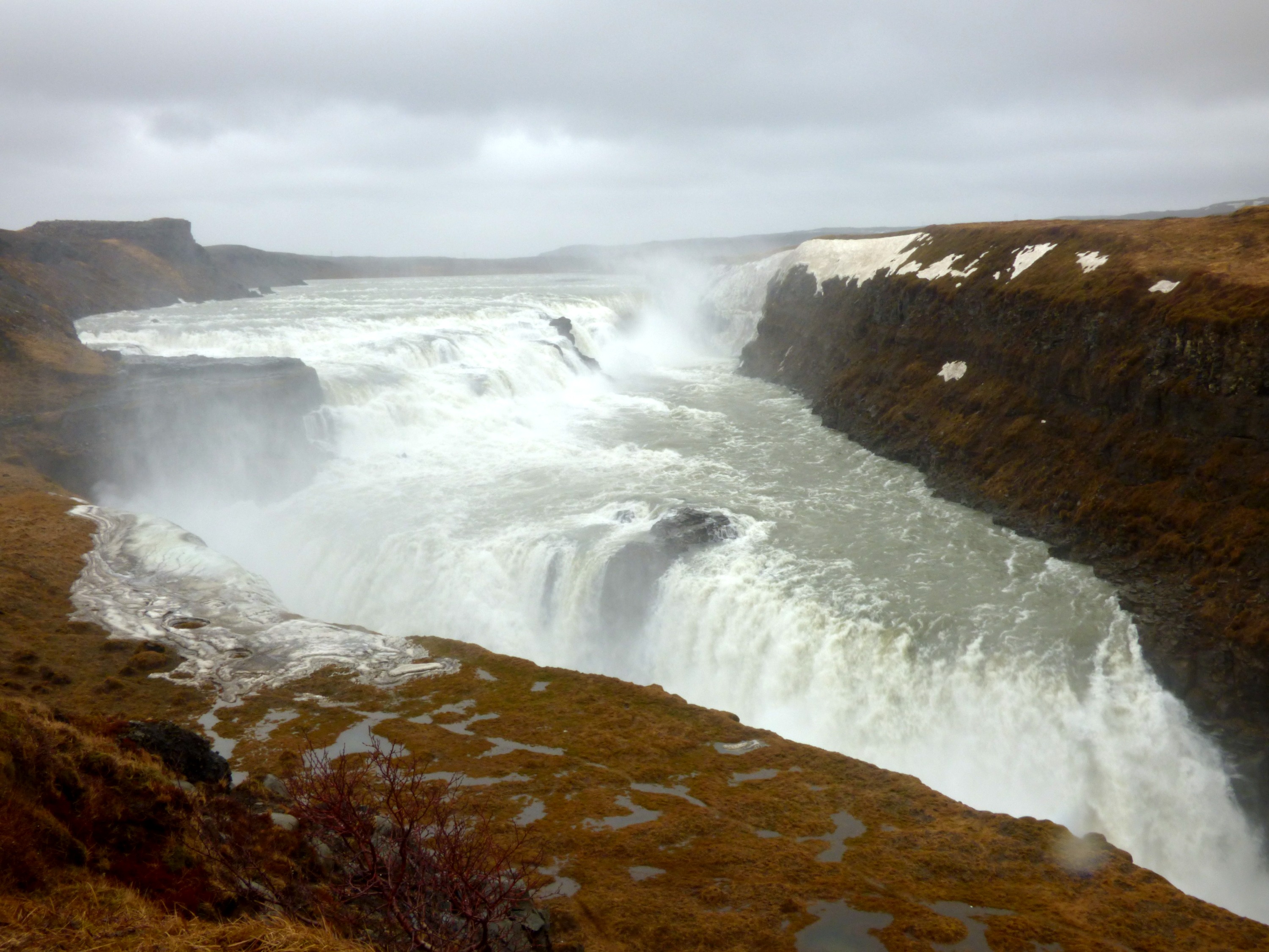 Ο πρώτος, στο ξεκίνημα του ταξιδιού μας ήταν ο Gulfoss. Αποτελεί έναν από τους χαρακτηριστικότερους καταρράκτες της Ισλανδίας, λόγω της εγγύτητάς του στην πρωτεύουσα (μιάμιση ώρα οδικώς), καθώς και του μεγέθους του. Είναι μέρος του «χρυσού κύκλου» (golden circle: περιλαμβάνει μία σειρά αξιοθέατων και είναι το μάστ για τον κάθε ταξιδιώτη). Αξιομνημόνευτος είναι ο θόρυβος που έκανε όσο τον πλησιάζαμε (μιλάμε για απίστευτες ποσότητες νερού να κατρακυλούν) και τα σταγονίδια που μας περικύκλωναν αφού τον φτάσαμε! Μπορείς να φτάσεις και λίγο πιο πέρα, αντικρίζοντας το σημείο πτώσης του καταρράκτη.