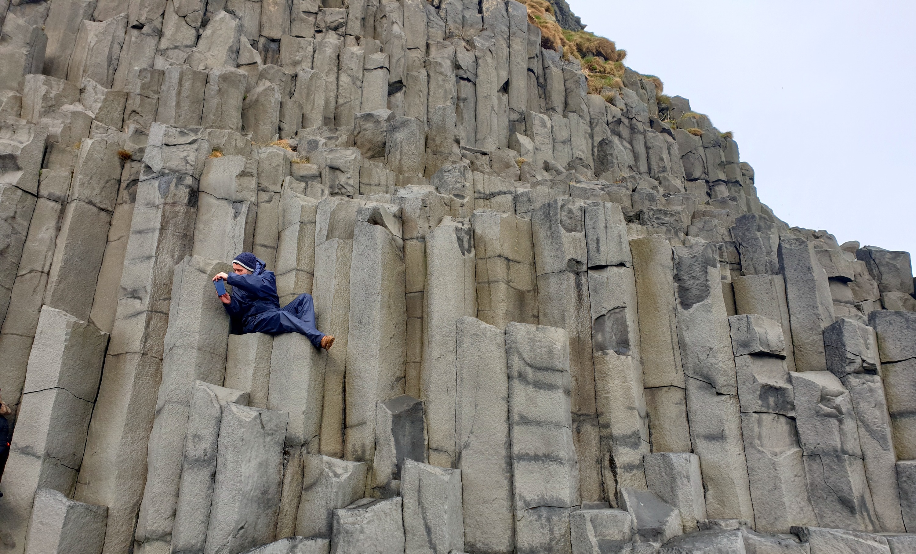 Είκοσι λεπτά μετά, βρεθήκαμε στην παραλία Reynisfjara, μία πανέμορφη παραλία που αξίζει να επισκεφθεί κανείς, με τις κολώνες βασάλτη, την κατάμαυρη άμμο και τους βράχους τρολ. Η παράδοση ισχυρίζεται πως αυτές οι πέτρινες κολώνες ήταν τρολ που προσπαθούσαν να τραβήξουν τα πλοία από τη θάλασσα στη στεριά. Η απληστία τους όμως τα παρέσυρε χρονικά. Με την αυγή, ο ήλιος τα πάγωσε και έμειναν εκεί να τα θαυμάζουμε εμείς, να τα σκαρφαλώνουμε αν θέλουμε και να θυμόμαστε να μην είμαστε άπληστοι. Ας μη ξεχνάμε ότι η άγρια ομορφιά του τοπίου συνοδεύεται από απρόβλεπτα δυναμικά κύματα, τα οποία μπορεί να πεταχτούν ξάφνου αρκετά μέτρα προς τα μέσα της παραλίας.