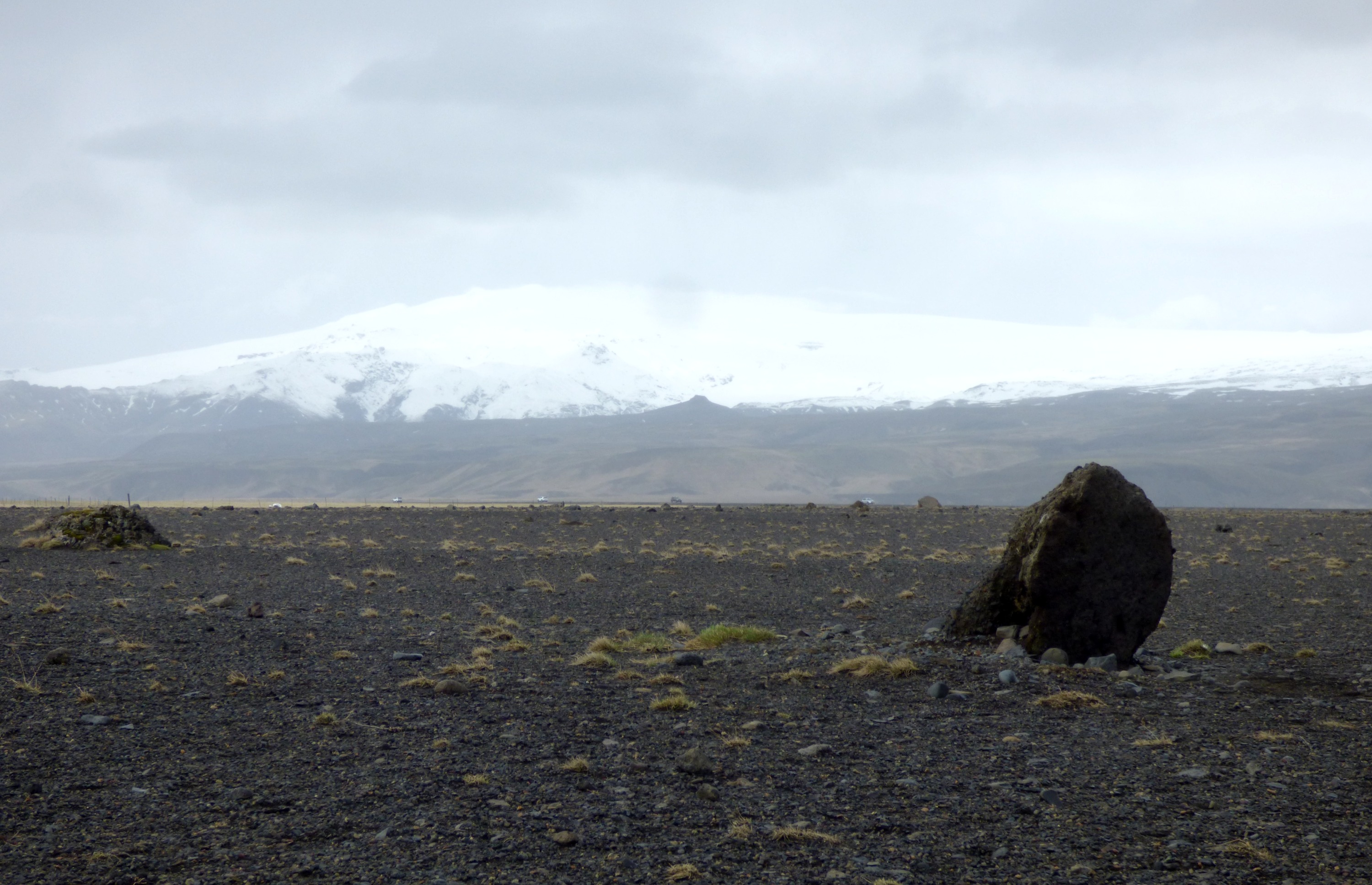 Παρόμοια σουρεαλιστικό σκηνικό το έχω και σε άσπρο! Φεύγοντας από το ερείπιο και πηγαίνοντας αντίθετα του ρολογιού βρεθήκαμε στο Skastafell National park. Εκεί, περπατώντας ωσάν τα αγριοκάτσικα, στις παρυφές ενός λόφου σε ένα στενό μονοπάτι, πλησιάσαμε τη γλώσσα ενός παγετώνα και βρεθήκαμε να ατενίζουμε μαγεμένοι. Το θέαμα περιλάμβανε τεράστιες μάζες συμπαγούς πάγου και μία λίμνη, αποκύημα της σμίκρυνσης του παγετώνα (όπως συμβαίνει και με όλους τους παγετώνες λόγω της κλιματικής αλλαγής). Το απέραντο άσπρο διακόπτονταν από μαύρες στάχτες των παρακείμενων ηφαιστείων και κάποια πέτρινα χειροποίητα γλυπτά, τύπου στήσιμο πετρών για να παίξουμε