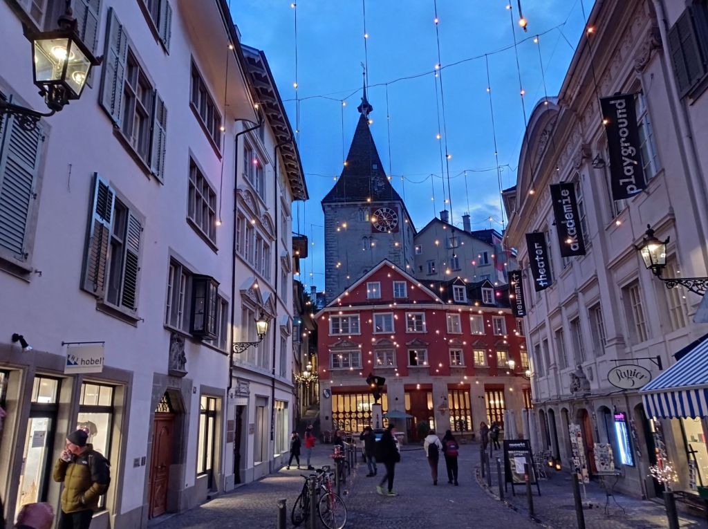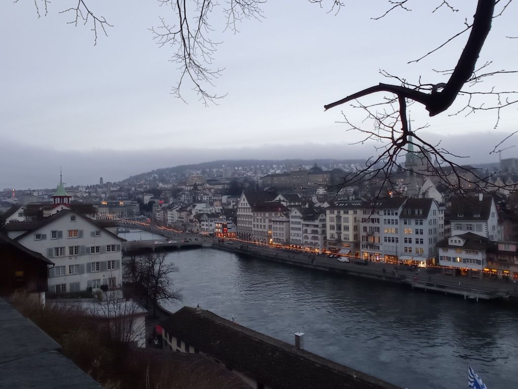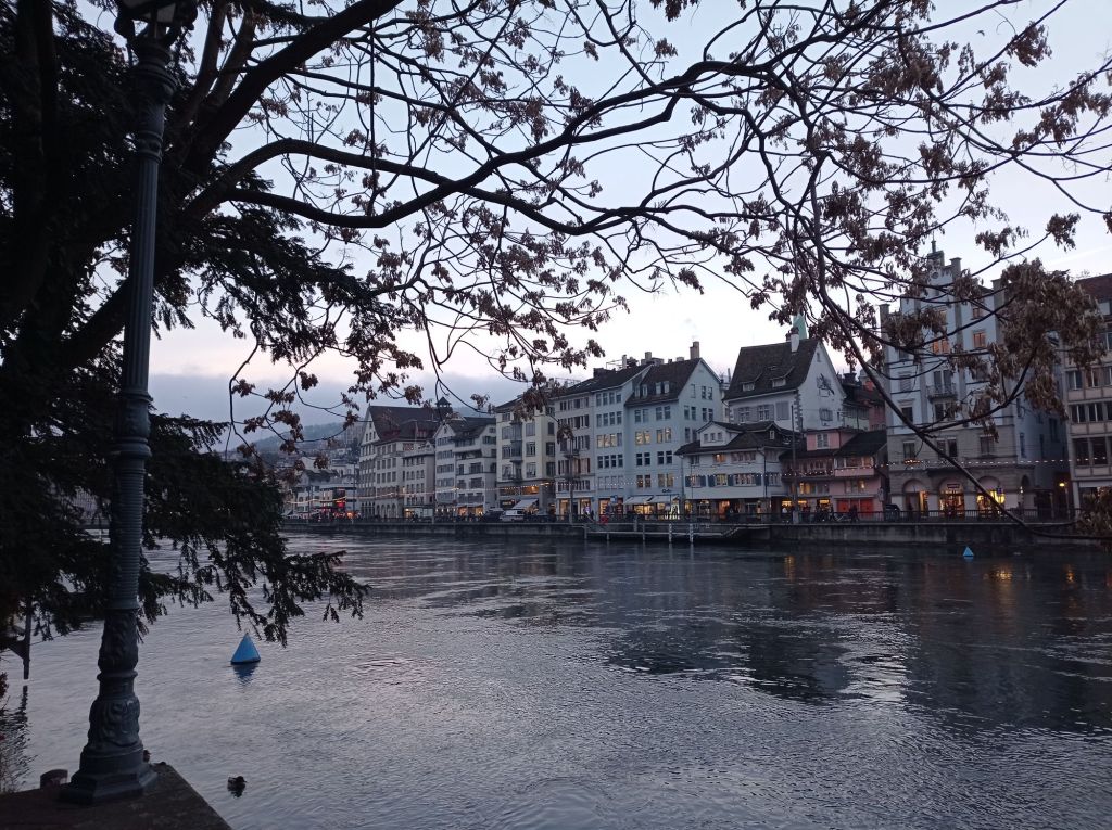 Και να το πάλι το ποτάμι, και να η εκκλησιά, να οι στέγες με τα καφετί κεραμύδια, να οι καμινάδες που αχνίζουν. Όλη η Ζυριχη στο πιάτο! Και στον ουρανό, να κάπου εκεί, ένα φάντασμα πετάει κρατώντας απ’ το χέρι τον γεροστριμμένο τον Σκρούτζ και χάνονται κάπου πιο βαθειά στα στενοσόκακα της πόλης! Ξυπνάμε κι εμείς απ’ την ονειροπόληση και κατηφορίζουμε χαμογελαστοί.