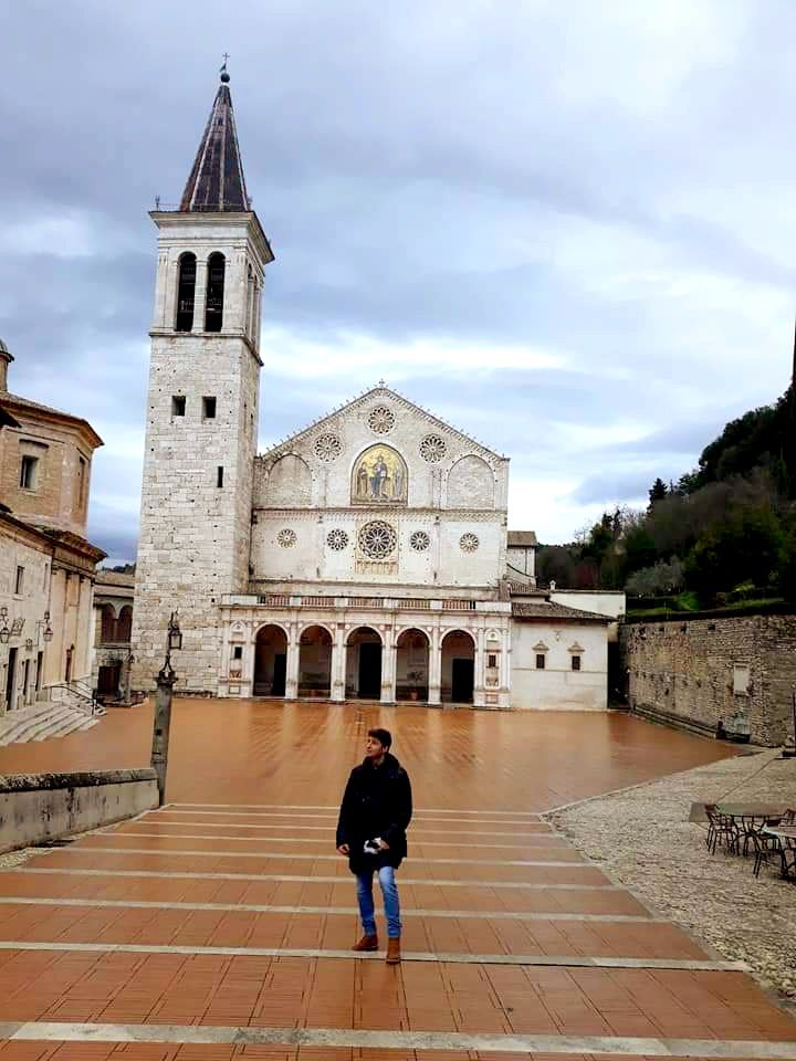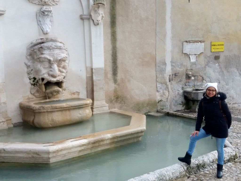 Πήραμε το τρένο αργά το πρωί, και σε μία ώρα και δέκα λεπτά, αφού προσπεράσαμε την Ασίζη, το Φολίνιο και το Τρέβι, φτάσαμε στον προορισμό μας. Ανηφορίσαμε λοιπόν προς το κέντρο του Σπολέτο, χαρούμενοι και με εξερευνητική διάθεση. Ο ήλιος μια έκανε την εμφάνισή του και μια κρυβόταν πίσω από κάτι μαβιά σύννεφα. Κάναμε μια στάση για να ξεδιψάσουμε στο «απειλητικό» συντριβάνι Fontana del Mascherone (δίπλα στο μνημειακό σιντριβάνι υπάρχει ένα μικρότερο με πόσιμο νερό με μια επιγραφή σε μάρμαρο που γράφει «Bibe Viator» και καλεί κάθε ταξιδιώτη που τυχαίνει να περάσει από εκεί να ξεδιψάσει) και συνεχίσαμε να διασχίζουμε τα πλακόστρωτα δρομάκια μέχρι το κέντρο της μικρής πόλης.