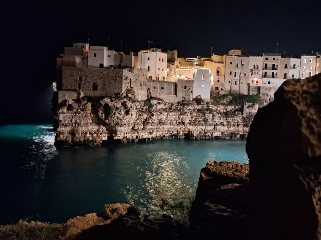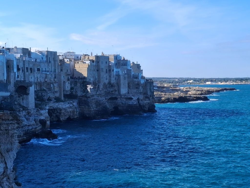 Το Polignano a Mare σε περιμένει. Και σε μαγεύει! Με τους απόκρημνους βράχους πάνω στους οποίους στέκει, με το μπλε της θάλασσας που σε περιβάλλει, με τα καλντερίμια του και τη ζωντάνια του, με τις αψίδες του, με τα γεφυράκια, με τα σκαλάκια και όλο αυτό το φωτεινό πανδαιμόνιο των παραλιών που σχηματίζονται σε κάθε εσοχή των βράχων. Σε μέρη σαν κι αυτό, τα λόγια είναι φτωχά. Αποχαιρετάς κάποια στιγμή την αγαπημένη Grotta Piana, παίρνεις δυνάμεις με ένα σάντουιτς με ζουμερές γαρίδες από το φημισμένο «Pescaria«, και συνεχίζεις προς την Μονόπολη.